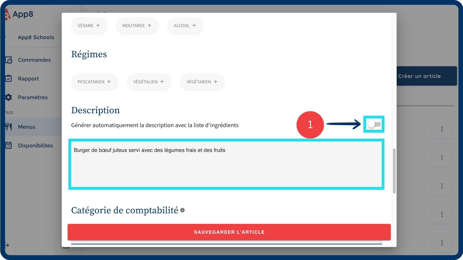 Saisissez une description ou activez le bouton de génération automatique si des ingrédients ont été ajoutés.